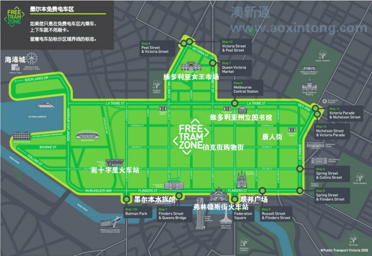 墨尔本市中心有一块Free Tram Zone的区域,涵盖了大部分 CityWalk 热门景点。 如果在这片区域上下车是不需要刷 Myki 卡的
